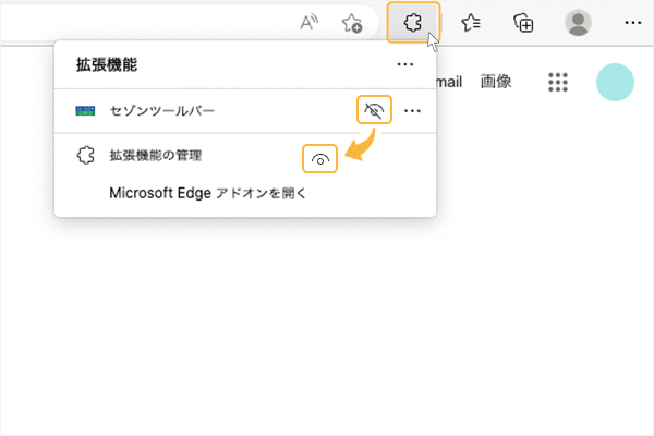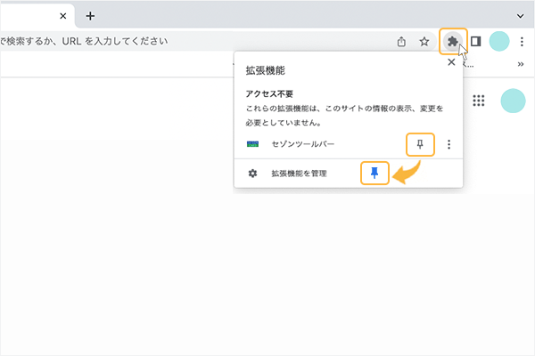 ブラウザ右メニューをクリックし、セゾンツールバーのアイコンがないか、確認してください。